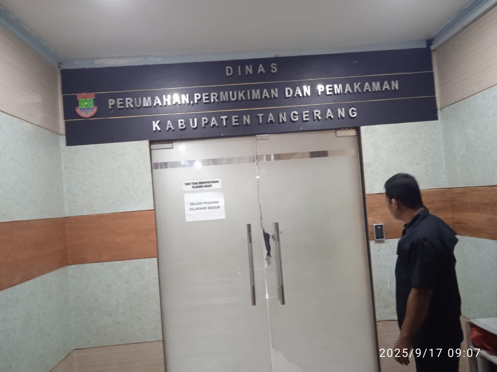 Begitu bunyi yang tertera di selembar kertas yang baru beberapa hari terakhir ini ditempelkan di pintu kaca masuk Dinas Perumahan Permukiman dan Pemakaman Kabupaten Tangerang yang berada di lantai 3 Gedung Lingkup Pekerjaan Umum Pusat Pemerintahan Kabupaten Tangerang di Tigaraksa.