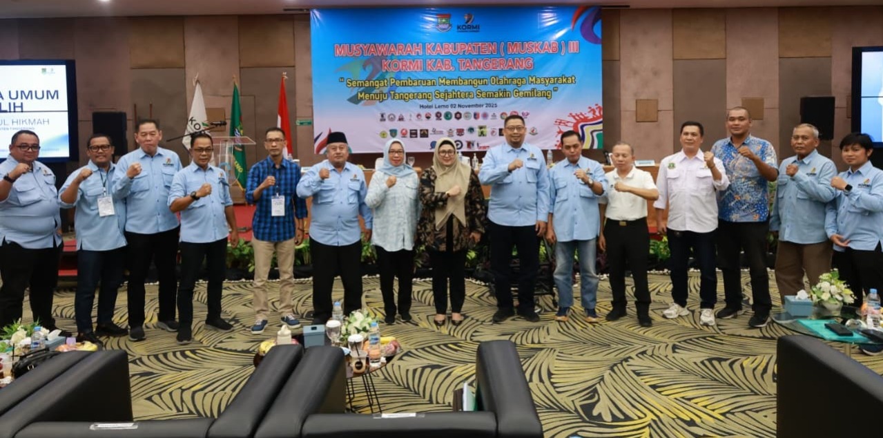 Wakil Bupati (Wabup) Tangerang, Intan Nurul Hikmah terpilih sebagai Ketua Komite Olahraga Masyarakat Indonesia (KORMI) Kabupaten Tangerang masa bakti 2025-2029 melalui Musyawarah Kabupaten (Muskab) ke-3 KORMI 2025 di Hotel Lemo, Minggu (2/11/25).