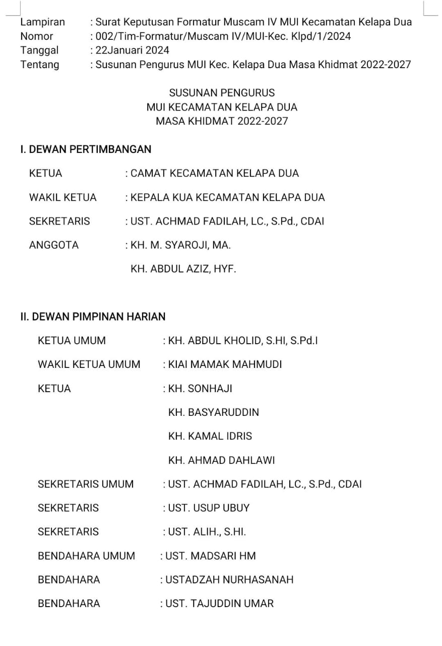 Dan juga MUI di Kecamatan Kelapa Dua ini dapat bersinergi dengan berbagai elemen masyarakat termasuk dengan organisasi dan lembaga lainnya.