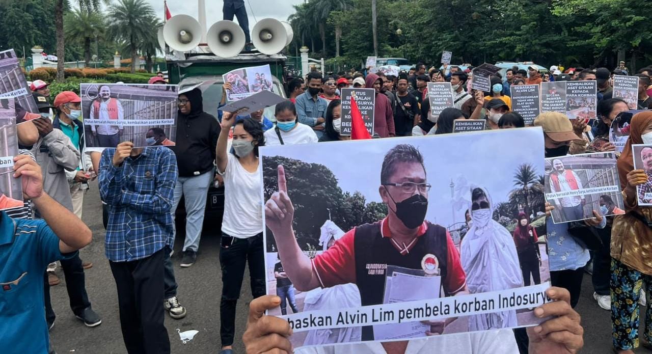 “Putus bersalah Henry Surya, kembalikan aset ke para Korban, Bebaskan Alvin Lim pembela masyarakat.”