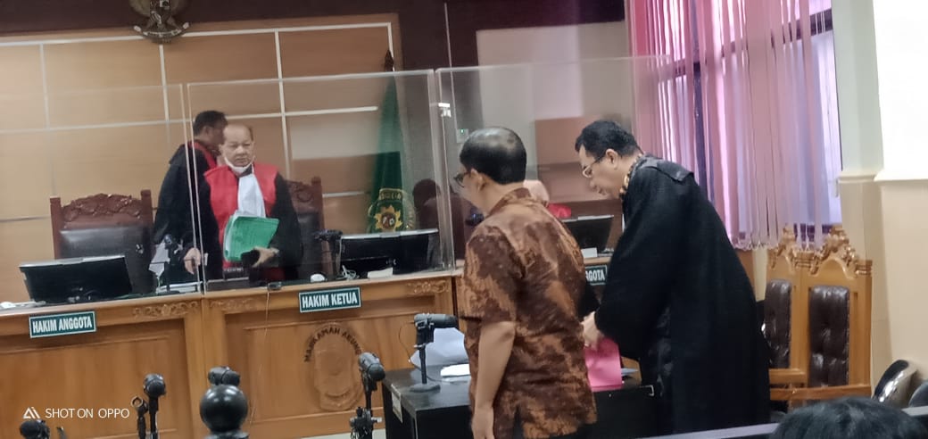 Ini ga beres penyidik yang memeriksa ada yang di lindungi ujar majelis”, Karna terdakwa sebagai humas pemenang tender ada perjanjian tidak ujar majelis hakim.